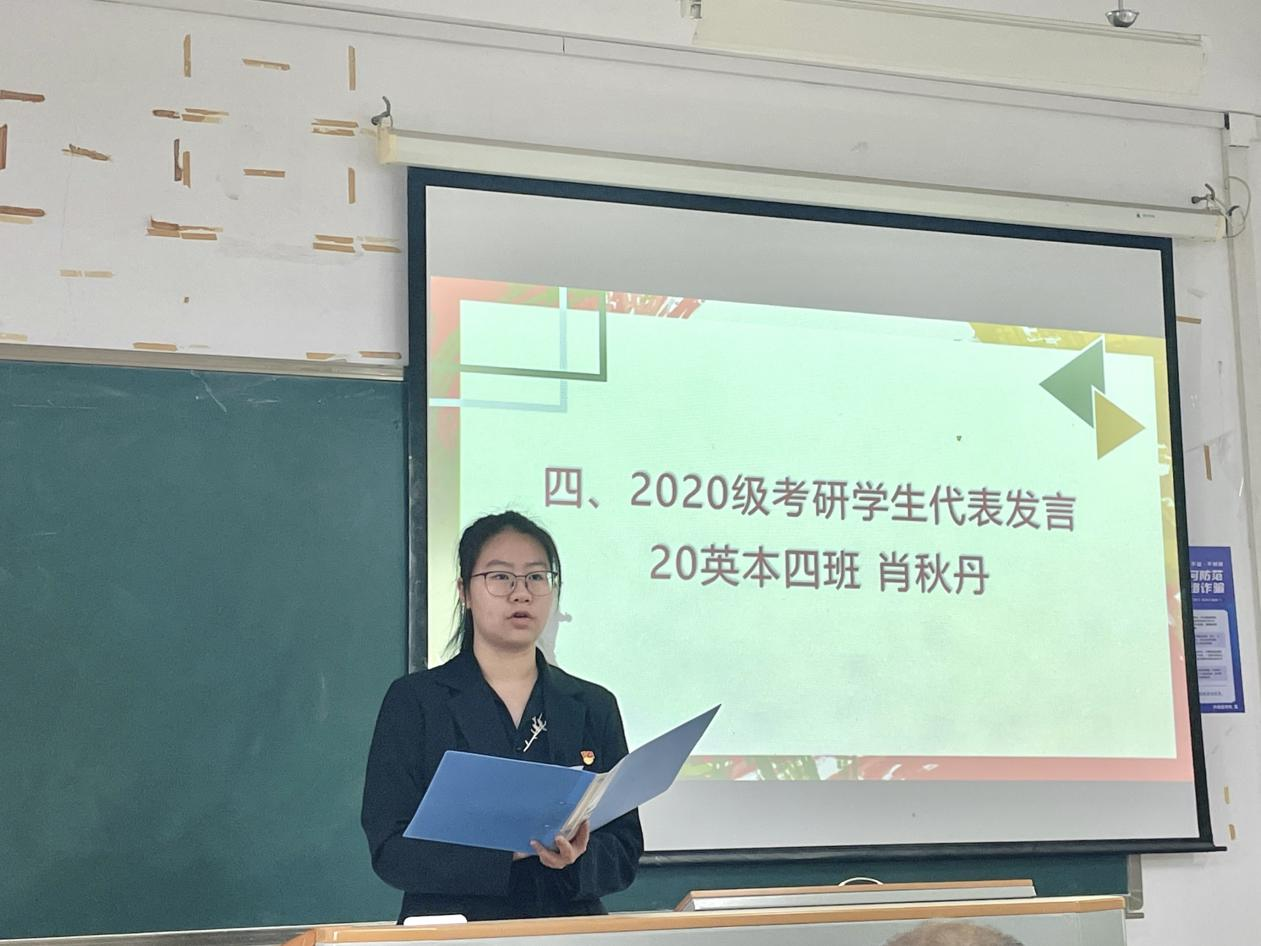 2024届考研学生代表肖秋丹作表态性发言表示,考研是新的起点、新的征程,同学们需要以自信的姿态,以最饱满的热情和斗志,努力拼搏,奋勇向上,去取得新一轮的胜利,实现人生的跨越。同时,她也代表全体考研学子感谢学院的关怀和老师的教诲。
