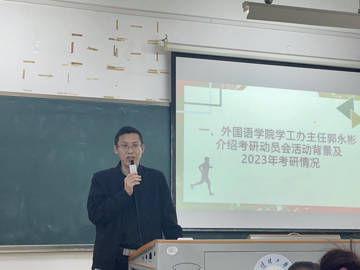 郭永彬首先向同学们介绍了本次动员会召开的目的以及我院2019级学生考研情况,嘱咐同学们大三是决定考研的关键时期,要提前做好规划,并表示学院将为考研学子做好后勤服务工作。