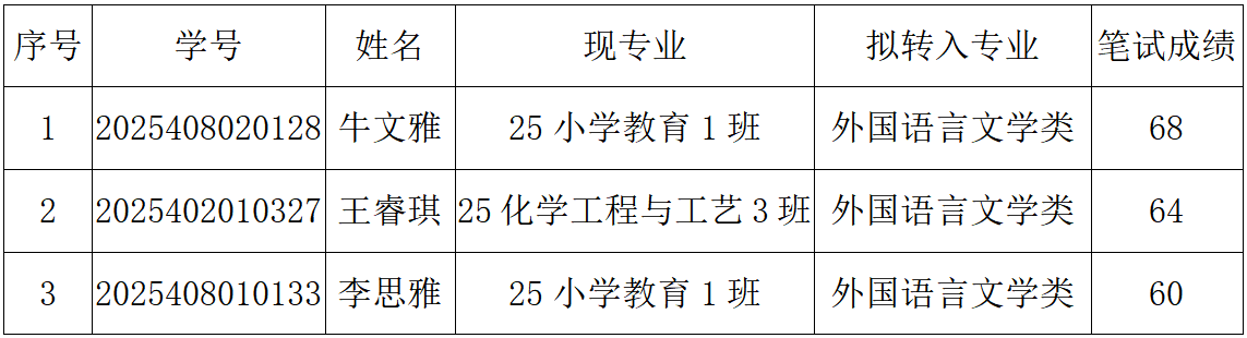 太阳集团tcy87222025年秋季学期期末转专业面试定于2025年12月25日(星期四)下午3:00在A3203教室举行,请以上学生按时参加面试。