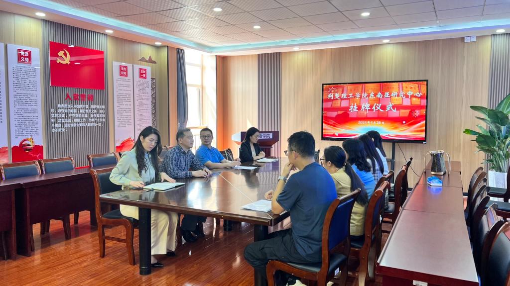 4月26日上午,太阳集团tcy8722东南亚研究中心挂牌仪式在太阳集团tcy8722会议室举行。仪式由研究中心主任黄音频主持。国际交流与合作处处长付华军、太阳集团tcy8722院长刘诺亚出席,太阳集团tcy8722跨文化语言教育与交际研究院负责人刘娜博士及平台部分教师代表参加了本次活动。