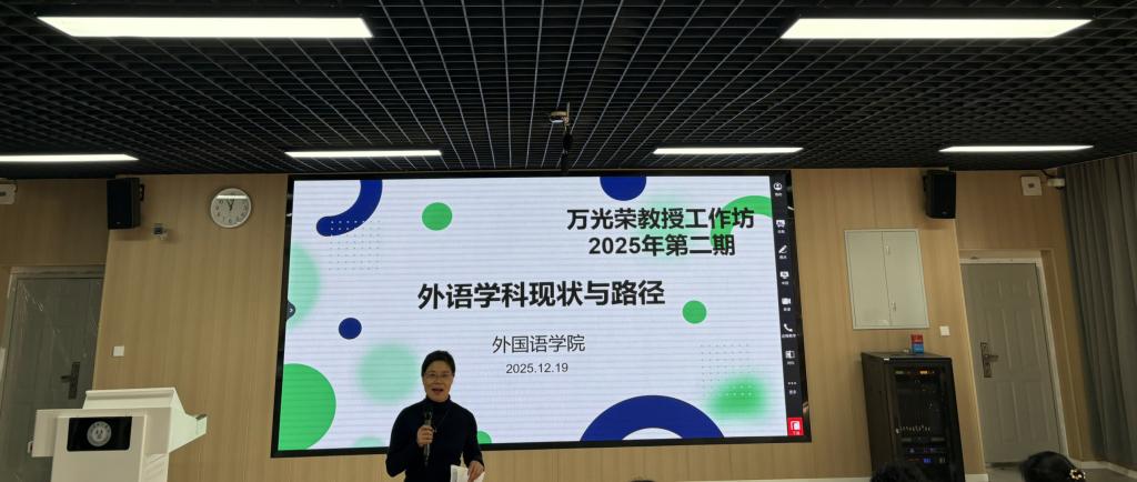 在下午交流指导环节,我院三名博士就个人近期申报主题进行分享,骆悠悠博士《AI赋能教学视域下的读后续写教学设计研究》、田甜博士《英汉中动结构的拓扑学研究》及杜卿博士《初中教师课后服务适应水平的问题现状和应对策略》,万教授围绕"国家社科基金青年项目申报要点",分别进行评论并给与针对性指导。在互动环节中,万教授引导资深教师与青年学者开展"头脑风暴",针对"研究变量控制""数据来源可靠性"等共性问题展开深度研讨,形成了多项具有落地价值的修改方案。这种"一对一诊断+集体会诊"的模式,有效破解了青年教师在项目申报中的瓶颈困惑。