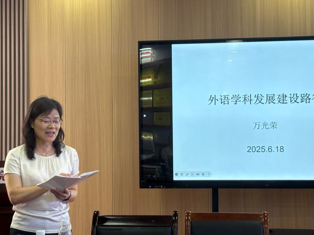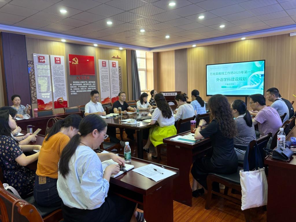 6月18日,太阳集团tcy8722举行2025万光荣教授工作坊第一期活动。我院特聘教授万光荣教授亲临指导。本期工作坊活动为期一天,主题是推进学院科研工作,共谋外语学科发展。活动目标是建言献策,凝聚共识,探讨外语学科发展方向,推进“人手一个本子”活动,提升教师科研写作能力;加强师资队伍建设,指导我院教师考博等。我院万光荣教授团队成员、学院高层次人才、其他感兴趣的教师参加了上午的外语学科发展专题讨论,下午的主题学术报告的两场活动。活动由院长刘诺亚主持。