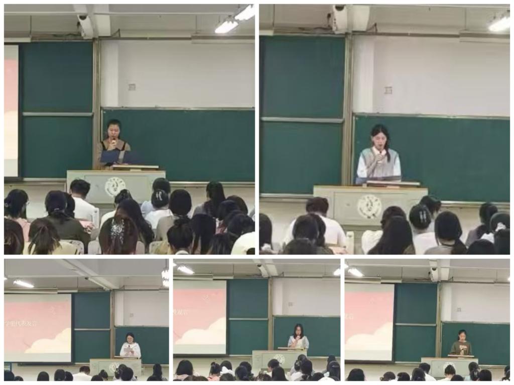 会议第二项,五位优秀实习生代表依次对自己的实习工作进行了分享和总结。英语专业实习生代表毛蕊睿、童欣怡、朱圆珺珉、肖扬、焦心雨分别从师德师风、教学工作、班级管理和教学研究四大板块分享了自己的实习经历,并表示这些生动鲜活的实践体会、指导老师的建议和实习收获是在书本上无法获取的,今后一定继续发扬严谨治学的精神,向成为一名优秀的教师不懈努力。