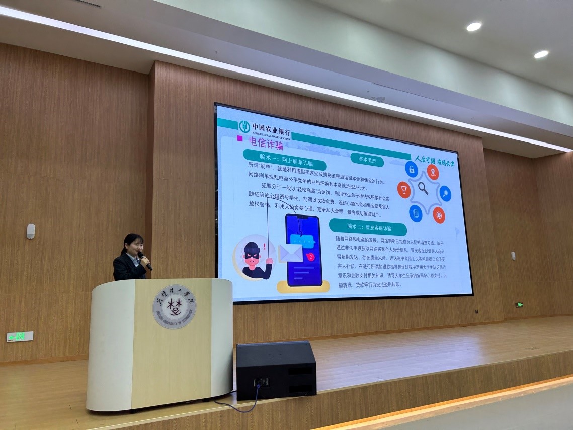 中国农业银行荆门东宝支行工作人员税小凤以真实案例为切入点,揭露了身边常见的诈骗陷阱,提醒同学们不被诈骗表象所迷惑,帮助同学们形成健康正确的消费观,提高大家的防诈骗意识和识诈反诈能力。