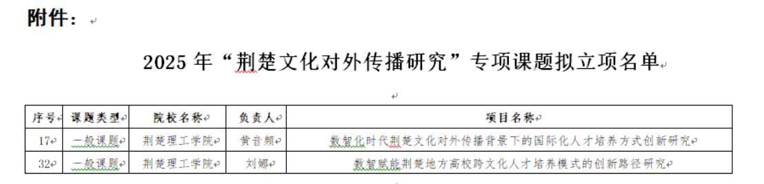 近日,湖北省社会科学联合会发文,公布了2025年度湖北省“荆楚文化对外传播研究”专项课题立项名单,我院黄音频和刘娜两位老师主持申报的《数智化时代荆楚文化对外传播背景下的国际化人才培养方式创新研究》和《数智赋能荆楚地方高校跨文化人才培养模式的创新路径研究》分别获批。