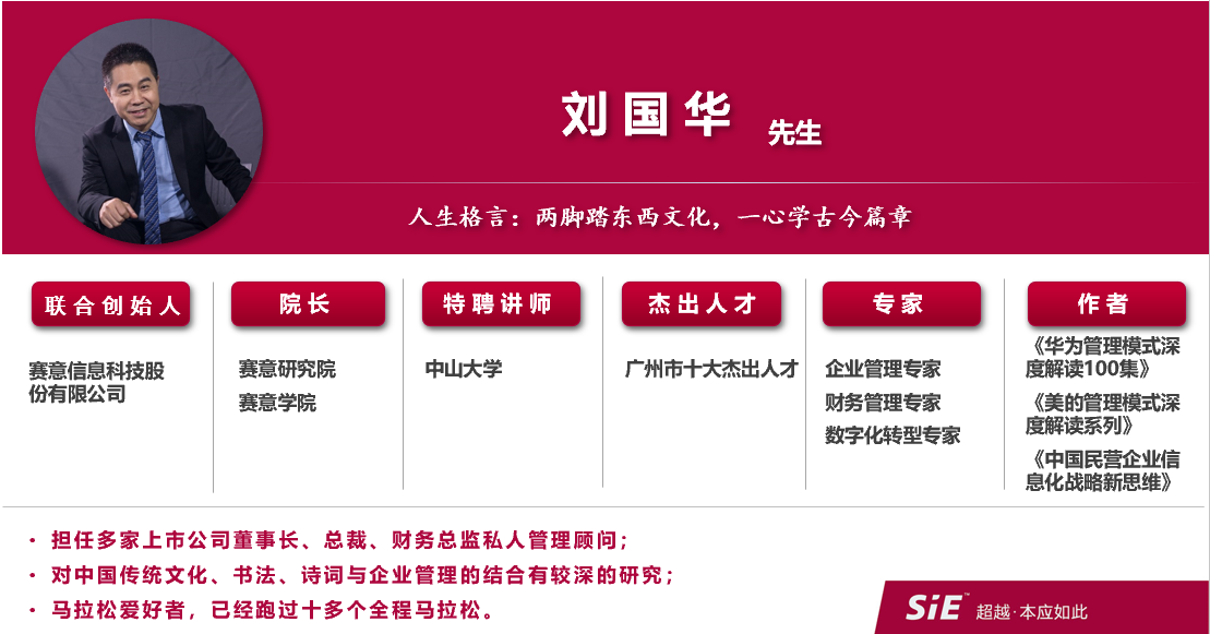 刘国华,赛意信息联合创始人,企业信息化建设专家,企业管理专家,财务管理专家,中山大学特聘讲师。曾担任多家上市公司董事长、总裁、财务总监私人管理顾问;著有《华为管理模式深度微解读100集》。